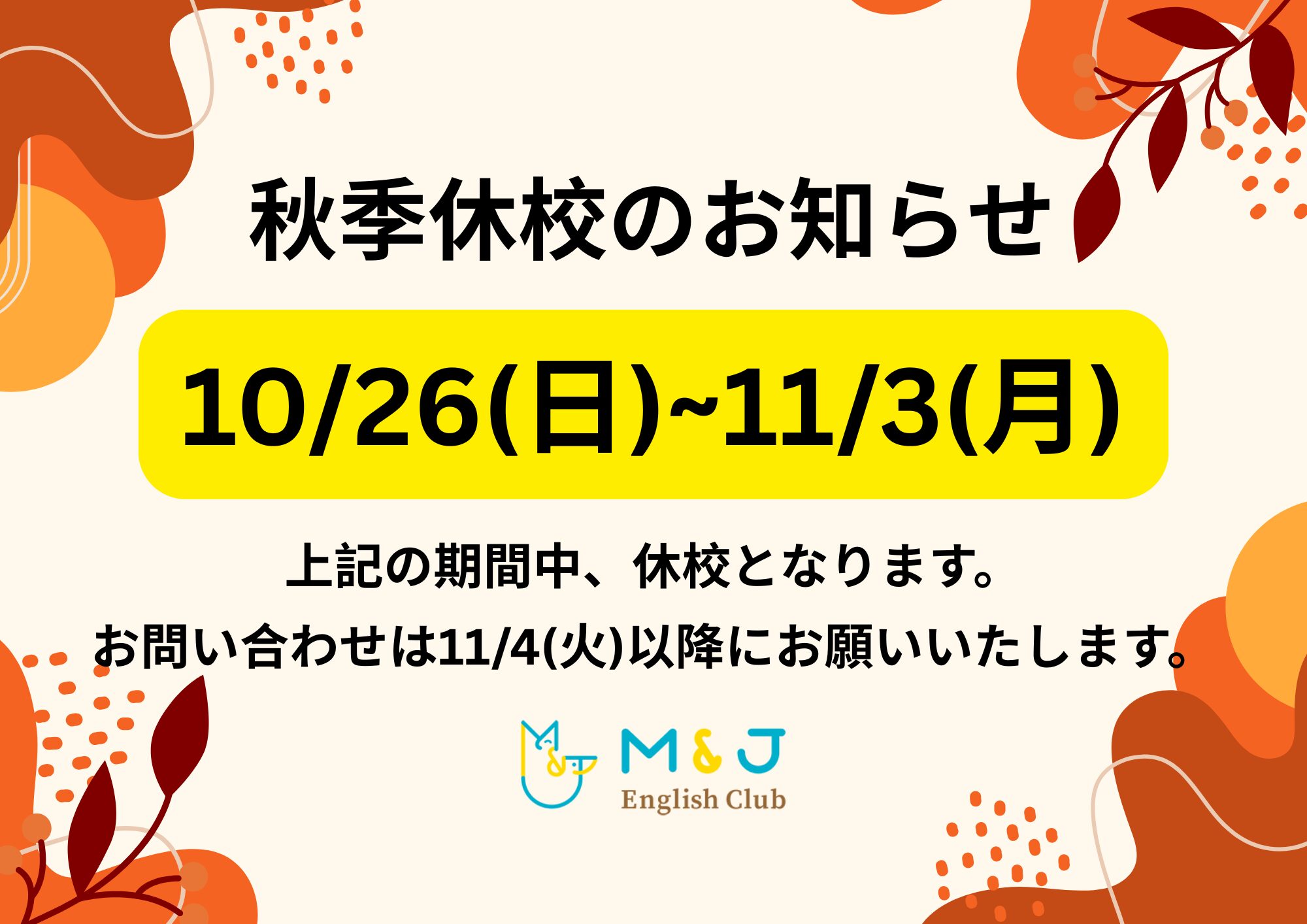 【NEW】秋季休校のご案内